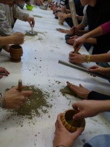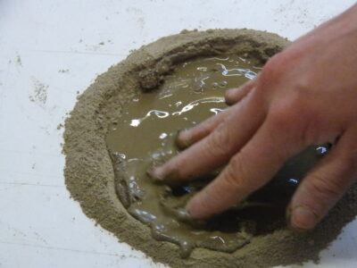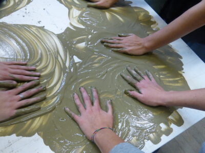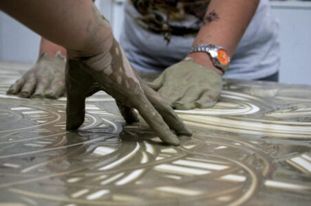 The workshop begins with dry clay transforming into liquid clay. Dry clay is finely powdered using a hammer or mortar, spread on an impermeable surface, and then mixed with abundant water until it reaches a creamy consistency. Between the surface and the palm of the hands lies the liquid clay, exerting a strong adhesive power that makes the hands stick to the surface like a magnet.