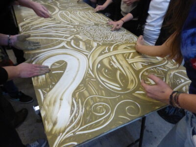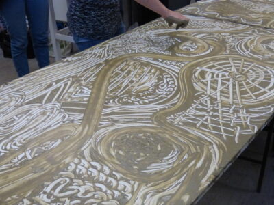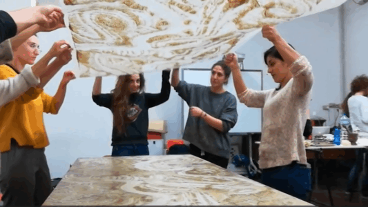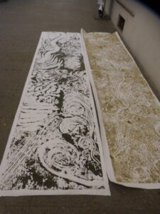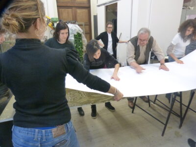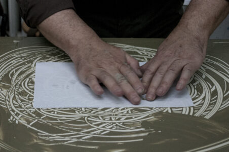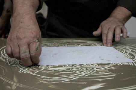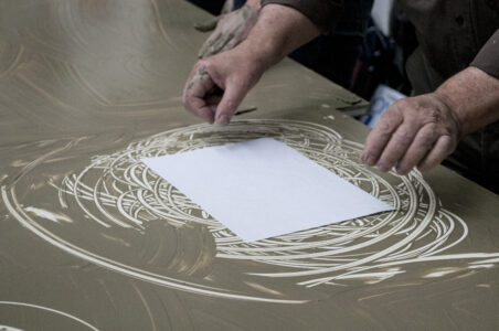 Now it is possible to make some printing tests by placing a sheet of paper, pressing lightly with the palm and fingers; lifting the paper from one edge reveals the first print made with liquid clay. After several trials to master the technique, a large monotype print can be made (see photos or videos). After completing the process and thoroughly washing hands, they become soft and velvety, thanks to the nourishing power of the clay.