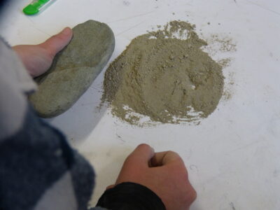 Si parte dall’argilla secca per iniziare il laboratorio con l’argilla liquida; con il martello o il mortaio si riduce in polvere finissima la creta secca, si dispone su un piano impermeabile, si aggiunge abbondante acqua e si impasta sino a raggiungere una consistenza cremosa.Tra il piano e la parte palmare delle mani è disposta la creta liquida, a svolgere un forte potere collante che fa aderire come una calamita la mani al piano.