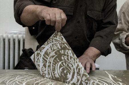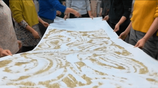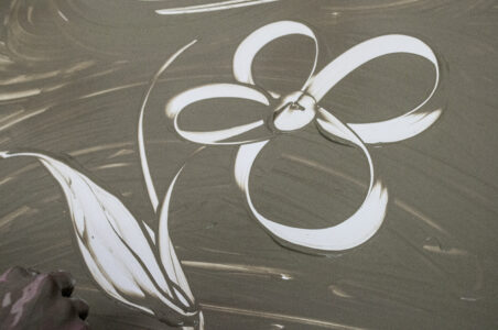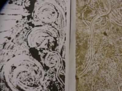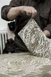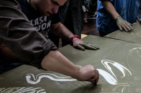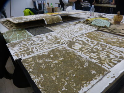 Ora è possibile fare alcune prove di stampa, poggiando un foglio di carta ed esercitando una piccola pressione con il palmo della mano e delle dita, sollevando il foglio da un suo lembo scopriremo la prima stampa con la creta liquida.A questo punto, dopo diverse prove per poter ben maneggiare questa tecnica, possiamo stampare il nostro monotipo di grandi dimensioni (vedi foto o video). Terminato il percorso e dopo aver ben lavato le mani, queste risultano morbide e vellutate, grazie al potere nutriente dell’argilla.